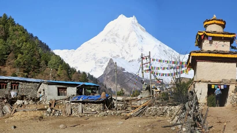 The trail ascends north to the Manaslu Base Camp, exploring rhododendron-covered hills, landslide areas, and Tibetan refugee villages.